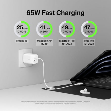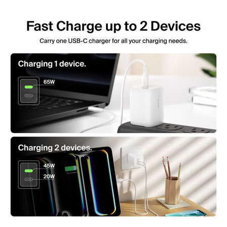 The Belkin BoostCharge Pro 65W Dual USB-C Wall Charger provides powerful and reliable charging for multiple devices at once. Thanks to advanced GaN (Gallium Nitride) technology, the charger is smaller, more efficient, and generates less heat compared to traditional chargers.